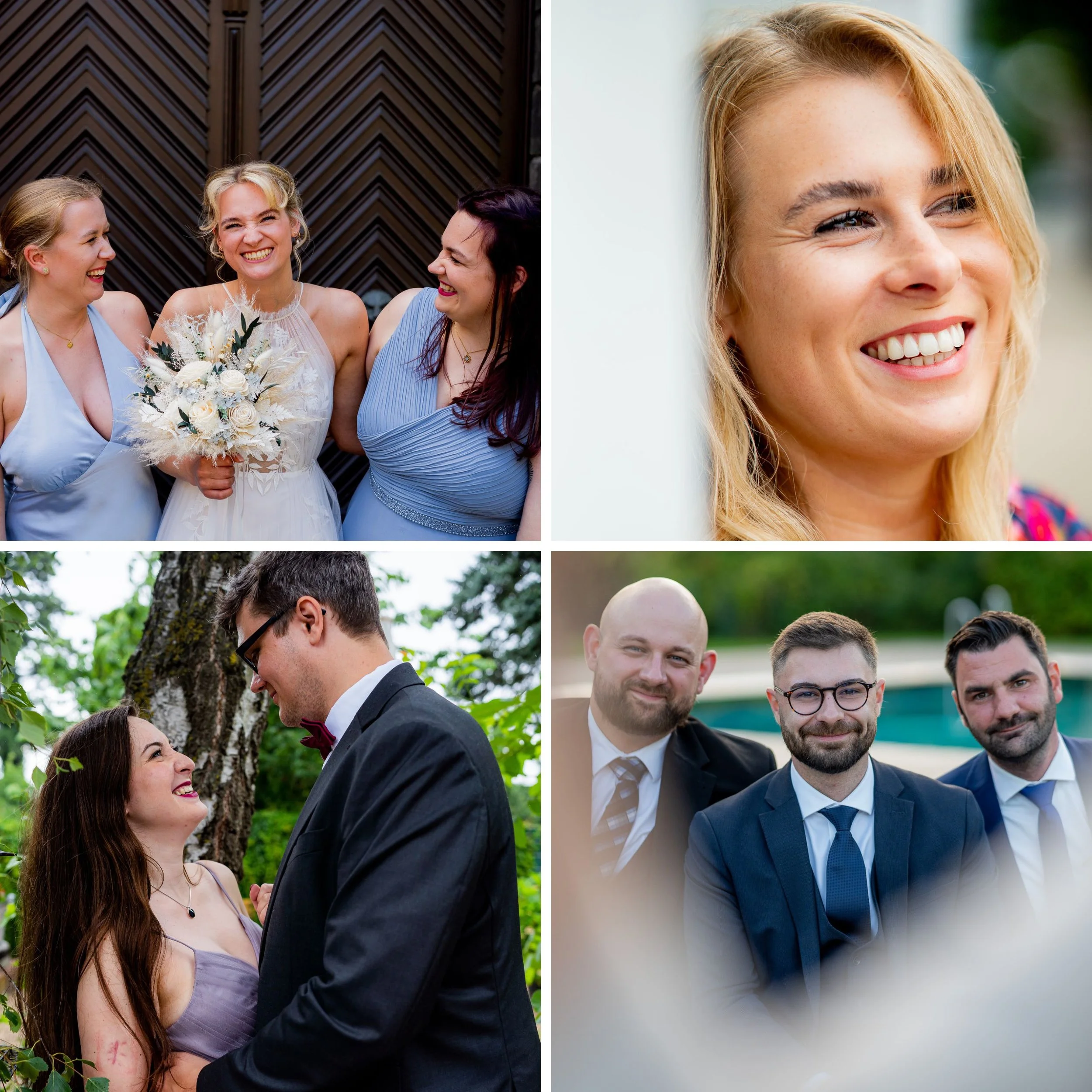 Vier Hochzeitsfotos mit Paaren und Brautjungfer.